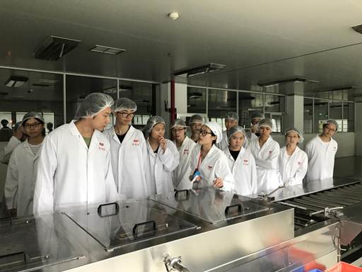 座谈结束后,药学院新生们在企业相关人员带领下,分批次参观了健康元集团研发中心、太太药业生产区以及质量控制中心。在参观研发中心时,同学们观摩了各种分析仪器,如高效液相色谱仪、气相色谱仪、薄层扫描仪等。随后,同学们参观了制剂研发的相关设备,如自动溶出仪、真空冷冻干燥机、恒温恒湿箱等。同学们在参观中药保健品生产车间时,由于车间对洁净度有严格要求,参观者必须戴头套、鞋套、穿参观服才可进入,所以大家都体验了进入生产线前的着装仪式。全副武装后的同学们非常兴奋,在车间领导的带领下,同学们参观了“太太口服液”灌装流水线,并学习了高温熔底缝合密封技术和带有特定专利的灭菌技术。参观完“太太口服液”整条生产线后,同学们纷纷感慨未来需要学习的药学专业知识很多。看到一款纯草本保健品从原料提取、灌装、灭菌再到包装的生产流程,一道道的严格检验都是为了保证产品的质量,同学们切身感受到了医药企业严谨的工作流程与责任意识。