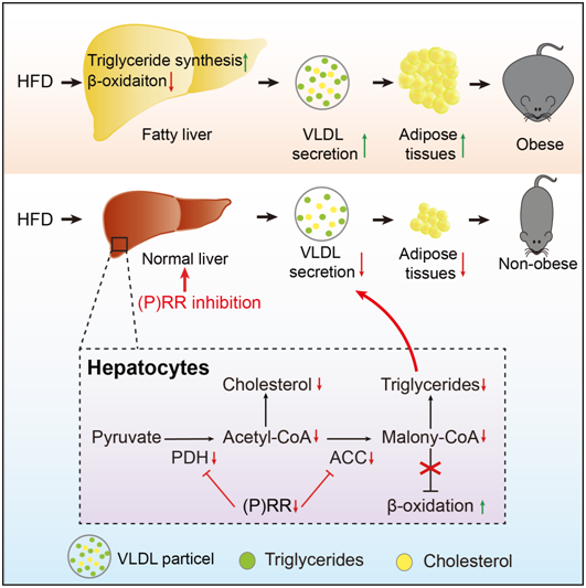 该研究团队和Ionis Parmaceuticals合作,利用糖基化修饰的反义寡核苷酸特异性地抑制了小鼠肝脏肾素(原)受体的表达,发现小鼠的氧消耗增加,血液中甘油三酯的水平大幅下降,且肝脏中的脂质水平大幅下降,提示了脂肪酸的合成和降解受到了影响。该研究团队利用蛋白组学和转录组学研究发现这一现象的产生主要是由于肾素(原)受体的缺乏导致了乙酰辅酶A羧化酶和丙酮酸脱氢酶的蛋白水平减少,从而减少了胞内乙酰辅酶A水平,增加脂肪酸的降解,减少了甘油三酯和胆固醇的合成。这一新的脂代谢靶点的发现为开发治疗脂肪肝、糖尿病以及家族性高脂血症提供了新的理论和实验依据。