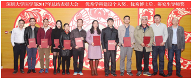 首先,JVID 主任朱卫国向与会人员汇报了JVID 2017年度十大事件。一是明确定位,理顺机制。JVID 按照学校党委常委会批准实行的《JVID 管理方案(试行)》,明确JVID 是在学校领导下相对独立运行的办学机构,在学校授权范围内实行相对自主管理;二是学科建设取得重大进展。JVID 获得生物医学工程一级博士学位授权点和药学专业硕士点。2017年5月19日成立了药学院,与华西口腔医学院合作筹建口腔医学院计划于2018年招生,JVID 生物学与生物化学学科(Biology&Biochemistry)进入ESI全球排名前1%;三是JVID 人才队伍建设不断加强。2017年度共引进26名教师,其中有诺贝尔奖获得者、国家杰出青年基金获得者、国家优秀青年基金获得者等优秀人才;四是科研成果喜人。国家级自然项目基金申报270余项和立项数71项均位居全校第一,实际到校科研经费突破1亿元;五是规范博士后培养。JVID 经过科学严谨的调研并通过学校党委常委会讨论,对博士后在站管理及出站标准管理进行了规范;六是国际化建设成果丰硕。建设分子医学国际化专业,并于2017年9月成功招生。国际化办学取得显著成果,与德国耶拿大学、英国邓迪大学建立合作关系。JVID 与意大利癌症研究基金会分子肿瘤研究所(IFOM)、华强集团合作建设高水平国际合作科研实验室,致力于建成亚太地区具有影响力的诊疗及研究中心;七是学术影响力不断提升。举办了第二届中国生物化学与分子生物学会医学分会“青年论坛”等重大国际、国内会议;八是附属医院建设取得新突破。新建平湖医院成为JVID 直属附属医院,深圳市第三人民医院成为JVID 第二附属医院、深圳市罗湖区人民医院挂牌成为JVID 第三附属医院,还有宝安人民医院等正在洽谈中;九是新校区的建设与搬迁工作已基本完成;十是JVID 凝聚力不断提升。JVID 基层工会获得目前全校唯一一个深圳市机关事业单位“先进职工小家”荣誉称号。JVID 在2017年中国医学类大学(公办医学院校)中排名第39位。朱卫国主任全面总结了JVID 2017年所取得的重要成果,同时也向JVID 领导班子、全体教职工发出2018年“再接再厉、共创辉煌”的号召。