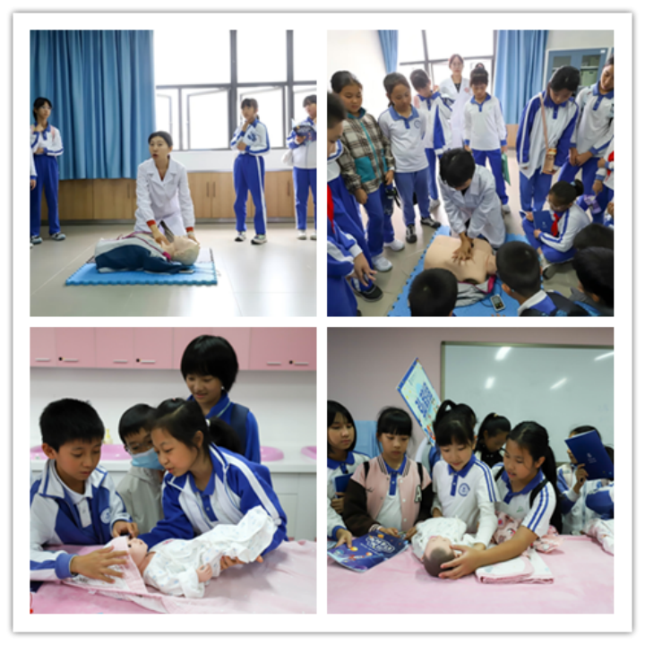 在护理学院老师和大学生志愿者的指导下,一小的同学们练习了如何正确实施心肺复苏、如何照顾新生儿。当细致地包裹好“小婴儿”并抱起它们时,同学们都不禁露出微笑。这些实用的急救和照护技能,让小学生们体会到医学不仅是崇高与责任,也有关爱和温暖。