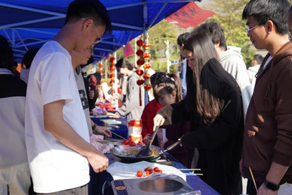 冰糖葫芦摊位则唤起了大家对童年美好时光的回忆。糖葫芦象征着喜庆、团圆和幸福,是新春贺岁的经典美食。师生们亲手串起红彤彤的圣女果、草莓、红提,制作出独一无二的糖葫芦。每一串糖葫芦都承载着满满的幸福与甜蜜,让人在品尝中回味童年的美好,感受冬日里的一抹温暖与甜蜜。