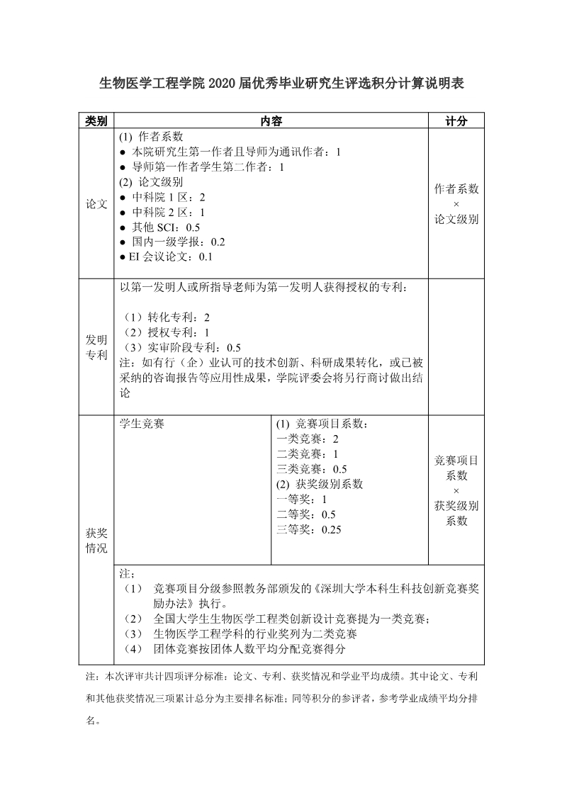 生物医学工程学院2020届优秀毕业研究生评选积分计算说明表