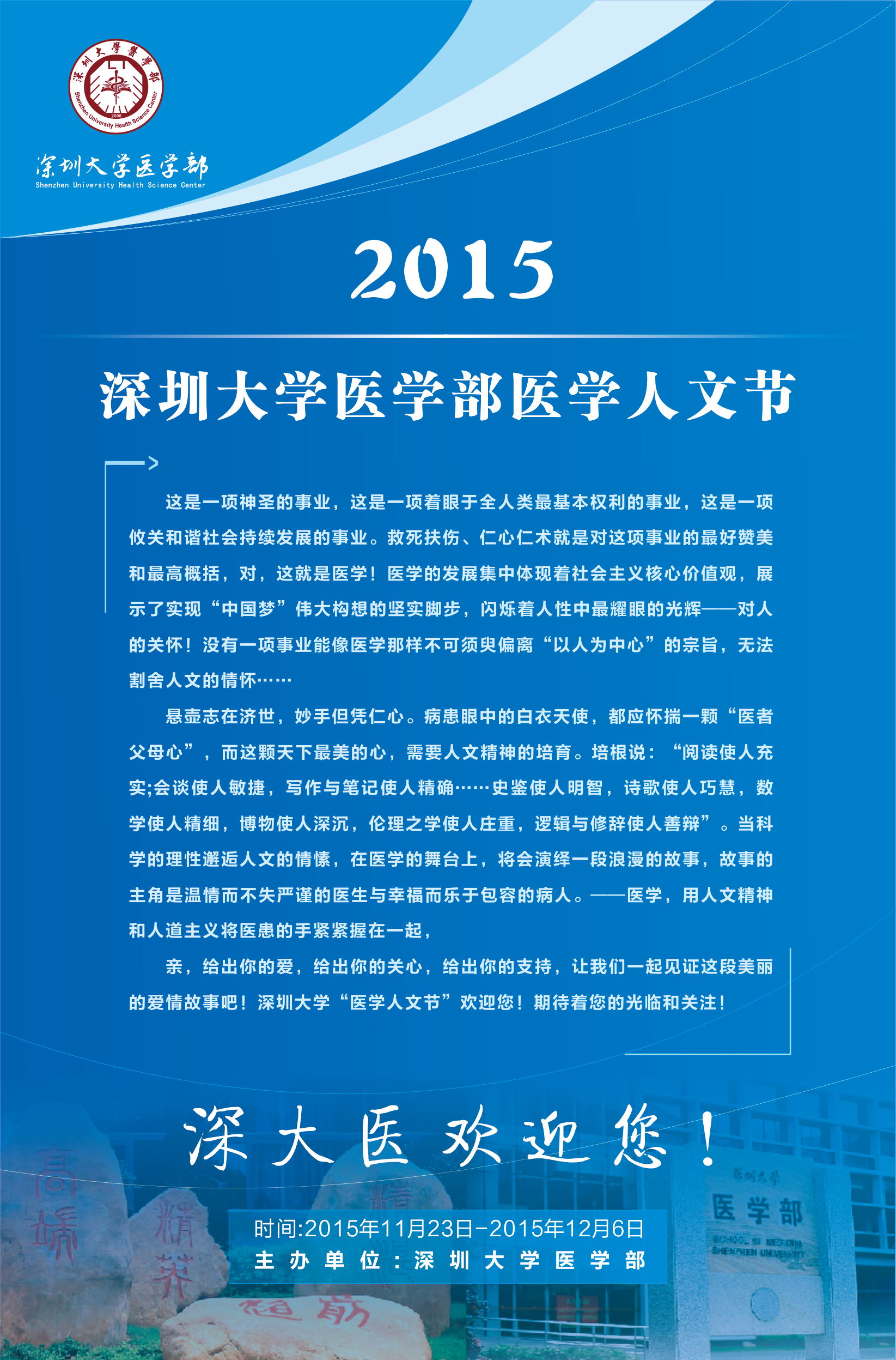 “2015JVID 医学人文节”预告 来源: 发布时间:2016-10-27 17:12:03 浏览次数: 次 【字体:小 大】 为弘扬医学人文精神,培养医学人文素质,JVID 定于2015年11月23日—12月6日举办“2015JVID 医学人文节”系列活动。活动主要包括:“医学人文主题学生文艺晚会”、“医学生公益展览”、“医学人文系列高端讲座”、“医学人文主题辩论赛”,及由来自各人文社科不同专业背景的博士参与的“医学和人文的对话——人文社会科学博士沙龙”,与学生进行密切互动。欢迎对医学人文感兴趣的师生参加! 点赞 收藏 分享到: 【打印正文】