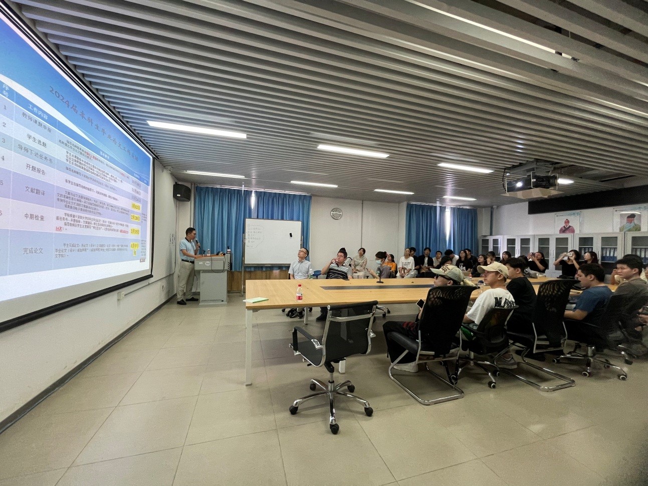 吴海强教授给全体本科毕业生及参会指导老师介绍了开展毕业论文工作的目的和重要意义,并围绕怎样做好毕业论文工作做了深度解读,同时给2023年新进教师开展了培训工作,使其熟悉毕业论文指导工作的流程及规范等。