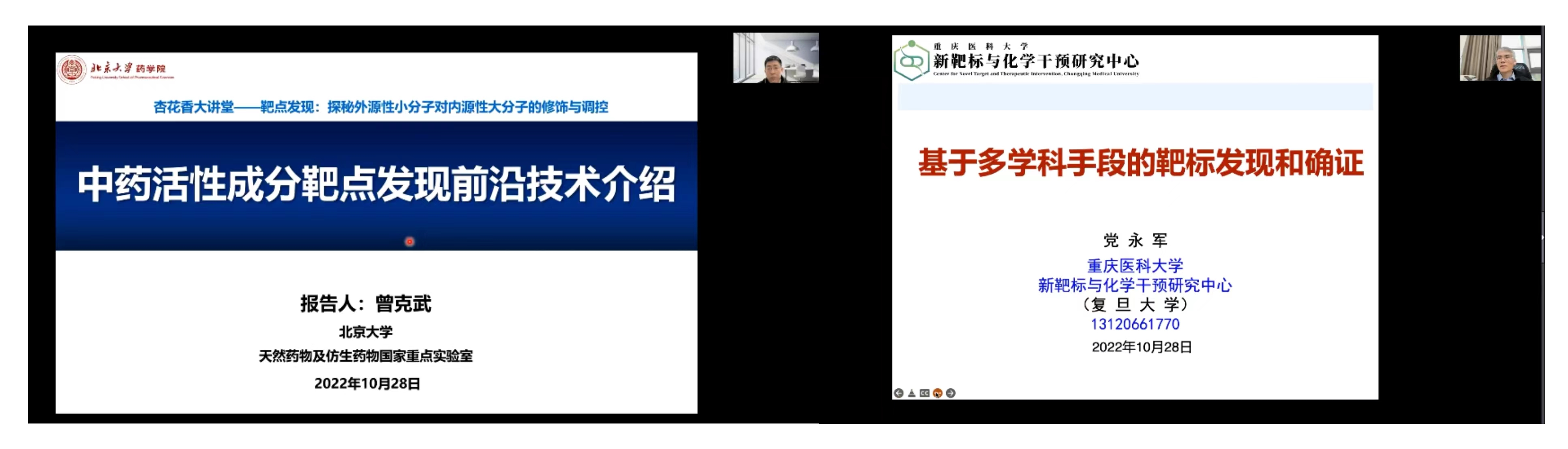2022年10月28日上午9点至11点40分,由JVID 中医药守正创新研究院联合JVID 药学院创办的第一期“杏花香大讲堂”学术论坛以线上会议形式成功举办。本次论坛由JVID 中医药守正创新研究院院长、JVID 药学院院长程永现特聘教授主持,北京大学药学院曾克武教授、重庆医科大学党永军教授围绕“靶点发现:探秘外源性小分子对内源性大分子的修饰与调控”主题,分别做了精彩分享。据统计,547名来自全国科研院所及高校的科研人员和学生在线参加了会议。