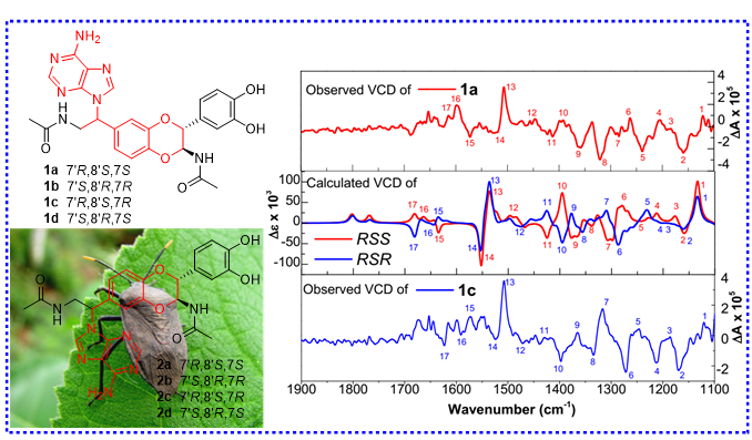九香虫具有温中补肾兴阳功效,团队从中发现了腺嘌呤与N-乙酰多巴胺二聚体杂合的天然产物。从平面结构看,存在二个位置异构体(Aspongdopamines A和B),而对于每个位置异构体,因存在3个手性中心,应该有8个立体异构体,但由于二氧六环上的构型被确定为反式,因此理论上每个位置异构体应存在4个光学异构体。天然产物通常是酶催化的结果,一般应具光学活性,但近年来天然产物的外消旋现象被普遍发现,经检测发现Aspongdopamines A和B均含有二对对映体。手性是影响生物活性的关键因素,为了阐明Aspongdopamines A和B的生物活性是否与光学活性相关,有必要对其进行手性纯化为光学活性物质。经不同手性材料纯化获得光学纯异构体,曾尝试圆二色谱结合量子计算解决其绝对构型,但由于不同异构体的Cotton效应近似,难以进行准确鉴定绝对构型。振动圆二色谱(VCD)是红外光区测定的圆二色谱,不依赖于发色团的存在,理论上可用于所有分子的绝对构型测定,但其应用依赖于量子化学计算和取决于样品量大小(灵敏度较低)。为了解决Aspongdopamines A和B中光学异构体的立体化学,团队进行了Aspongdopamines A和B的全合成和手性拆分,结合VCD测试和量子化学计算,最终精确鉴定了共8个光学异构体的绝对构型。体外抗肾脏纤维化模型筛选发现位置异构体对生物活性有较大影响,而化合物的光学活性对其生物活性的影响却较小。该发现对于认识此类化合物立体化学与生物活性的关系较为重要,也对于采取诊断信号确定柔性侧链上手性中心的绝对构型具有重要参考价值。
