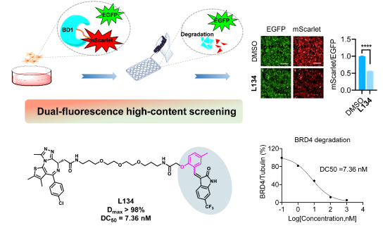 该研究团队在先前研究的基础上(PLOS Biol. 2024, 22, e3002550),新设计合成了一系列基于烯基氧化吲哚结构的BRD4-PROTAC先导化合物。采用mScarlet/ EGFP 的双荧光报告细胞系,结合细胞高内涵成像技术,实现了细胞中靶蛋白降解效率的高通量高效率评估。通过这种高通量筛选策略,该团队筛选获得了一种强效的BRD4-PROTAC先导化合物L134(Dmax > 98%, DC50 = 7.36 nM)。L134不仅能显著抑制多种乳腺癌细胞的增殖,还可抑制乳腺癌细胞迁移并诱导细胞凋亡,表明了L134的抗乳腺癌潜力。