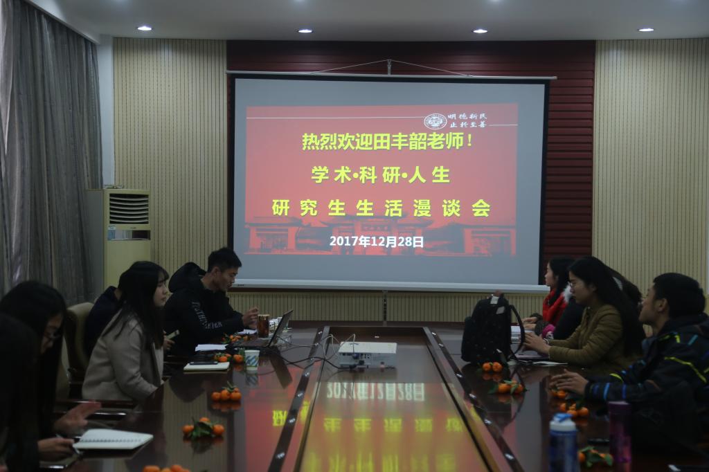 2017年12月28日下午,我院公共管理类研究生新生“学术•科研•人生”生活漫谈会举行。公共管理系田丰韶老师和优秀研究生代表、2015级社会保障专业研究生程茜受邀参加。我院17级全体公共管理类研究生积极与会。