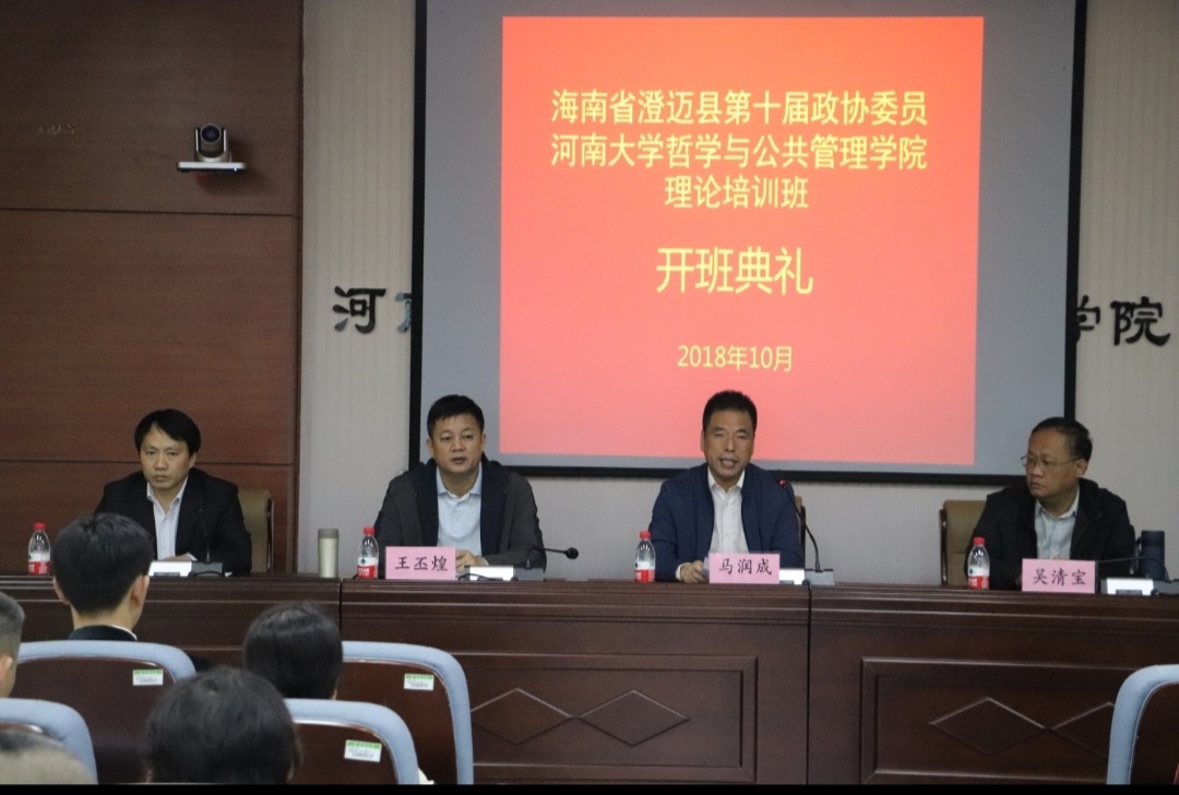 10月15日上午,海南省澄迈县第十届政协委员河南大学哲学与公共管理学院理论培训班在我院三楼第一会议室正式开班。学院党委书记马润成、副院长蒋军营、澄迈县政治协商会议第十届委员会副主席王丕煌、副主席吴清宝出席开班典礼。50余名县政协委员参加培训。
