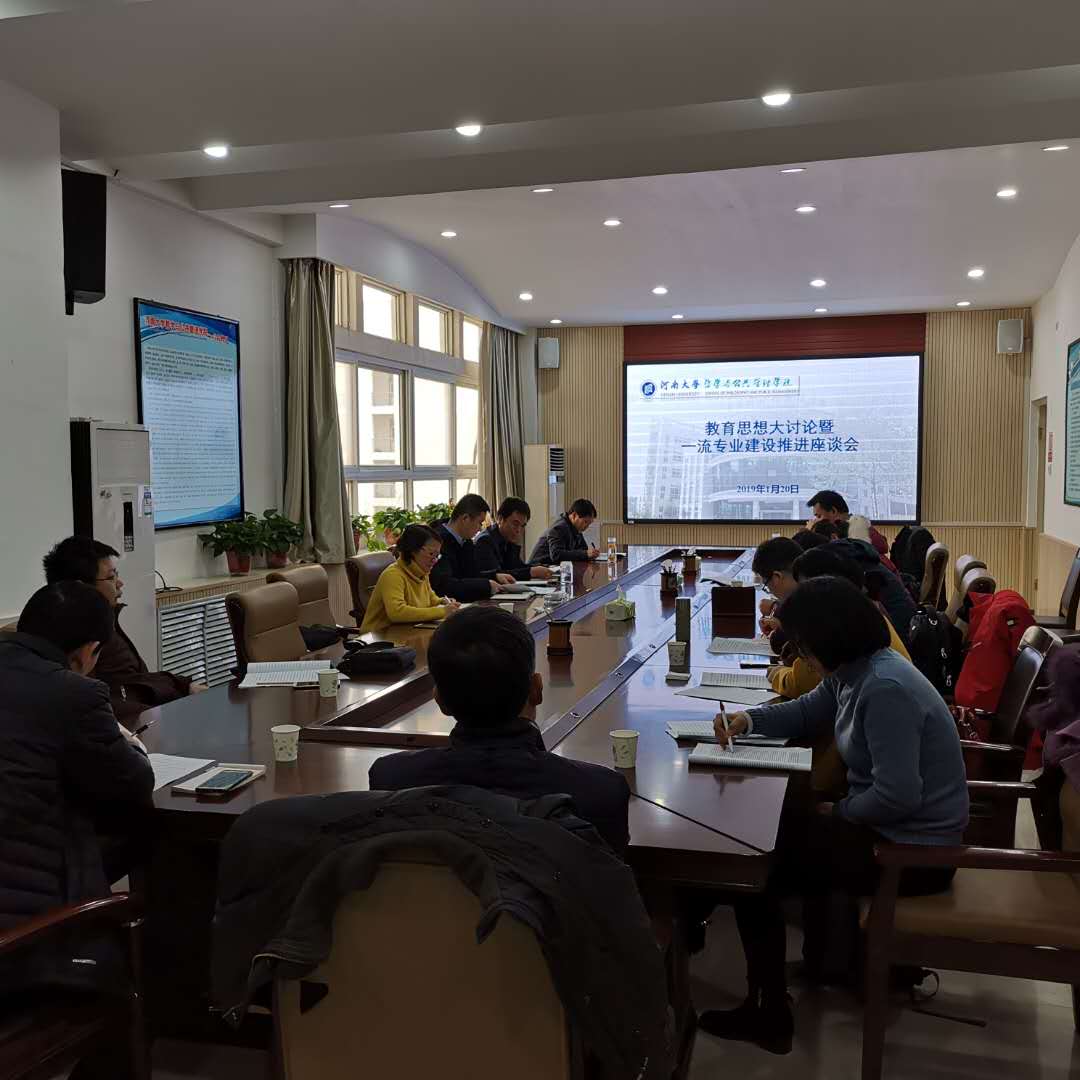 根据河南大学本科教育大会工作安排,1月20日上午,我院召开教育思想大讨论暨一流专业建设推进座谈会。学院全体领导班子成员、各基层教学组织负责人和支部书记、教师代表、教务管理和学生管理人员代表近20人参加座谈。