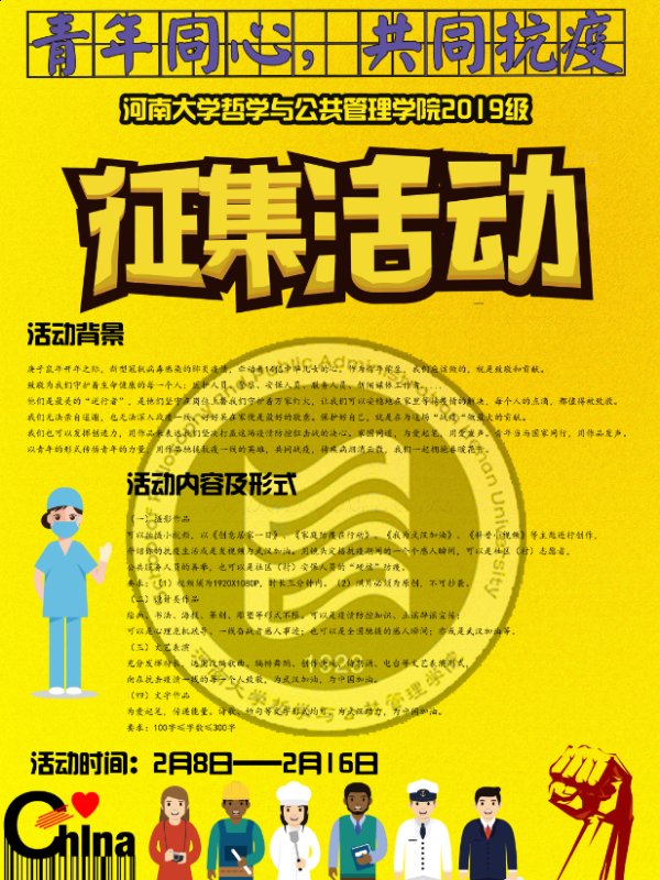 这个春天,新冠肺炎疫情牵动着14亿中华儿女的心。为表达青年学子对抗疫英雄的祝福和敬意,激发青年学子抗击疫情的信心和决心,展现青年学子家国情怀和社会责任感,2月8日—2月16日,我院2019级举行“青年同心·共同战疫”活动,声援抗疫一线的英雄。