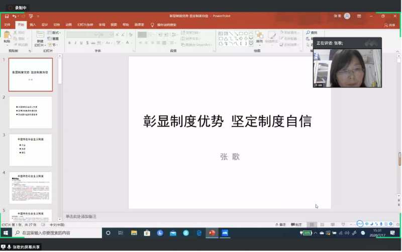 7月17日下午,我院“党课开讲啦”第三讲通过“腾讯会议”开讲。劳动与社会保障系张歌副教授以“彰显制度优势坚定制度自信”为题开讲。学院全体党员及入党积极分子聆听了本次党课。