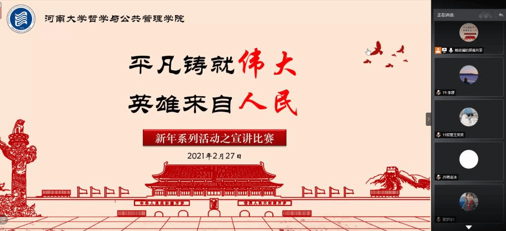 2月27日,我院于线上开展“了不起的中国人”主题微故事宣讲比赛。平凡铸就伟大,英雄来自人民。参赛选手将眼光聚焦于身边的人和事,从抗疫情到战洪水,从抗美援朝到脱贫战场,他们声情并茂地将人民英雄的事迹娓娓道来,歌颂他们舍小家为大家、牺牲个人、忠于民族的伟大爱国主义精神。2018级行政管理专业杨佳通过讲述燃灯校长张桂梅扎根山区,坚守教育的故事,诠释了时代楷模于己克俭、为民奉献的大爱无私。2020级公共管理类专业蒋金冰用饱满情感致敬抗美援朝的可爱战士,表达了当代青年人崇尚英雄,不忘初心的理想信念。一个有希望的民族不能没有英雄,一个有前途的国家不能没有先锋,传承英雄是时代永恒不变的主题。