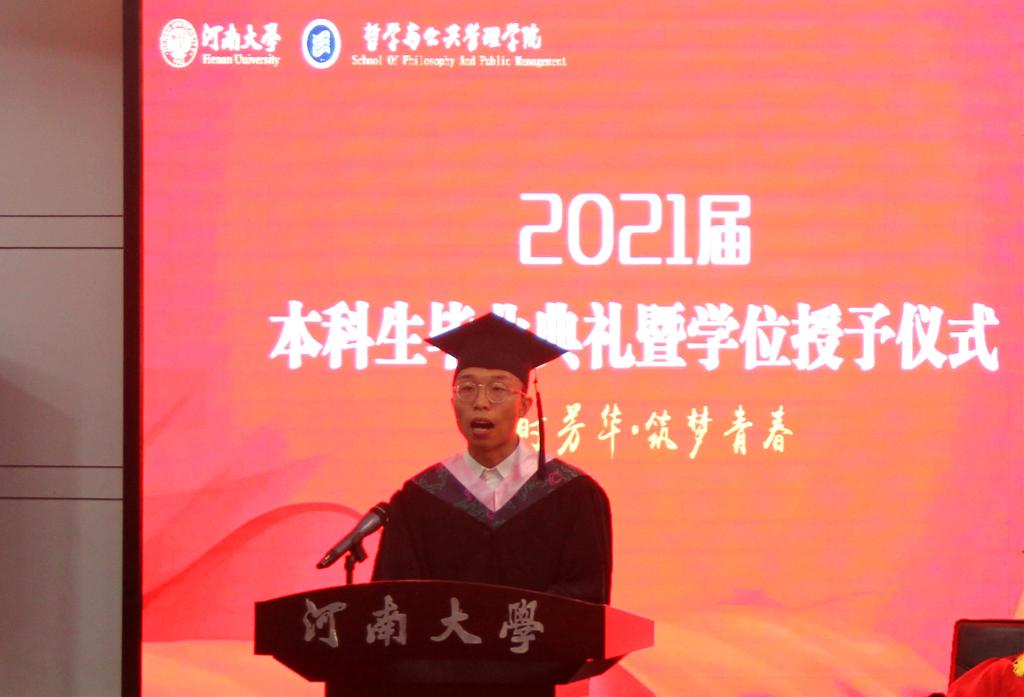 毕业生代表2017级公共事业管理专业谢豪东发言。他表示,大学时光珍贵且难忘,自己在迷茫中接受成长的洗礼,在忙碌中感受担当的力量,在拼搏中收获荣誉的幸福。同行四年,心怀感恩;未来无限,定将继续扬河大精神,担时代使命,传承青春事业。