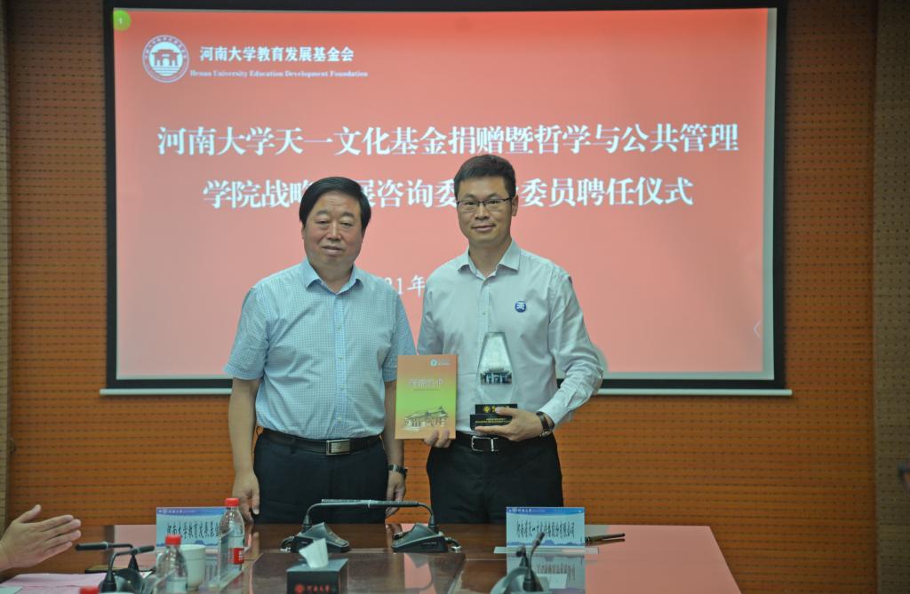 6月25日上午,天一文化基金捐赠暨我院战略发展咨询委员会委员聘任仪式在行政楼208会议室举行。河南天一文化传播股份有限公司董事长、我院原政治教育系87级校友董献仓一行,校原党委书记、学院战略发展咨询委员会主任孙培新,校党委常委、副校长许绍康出席仪式。校友工作办公室与教育发展基金会、学生处、研究生院、学院相关负责人参加仪式。仪式由校总会计师韩守富主持。