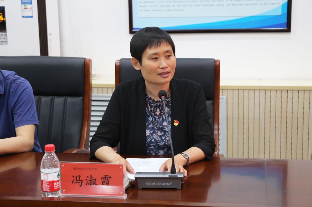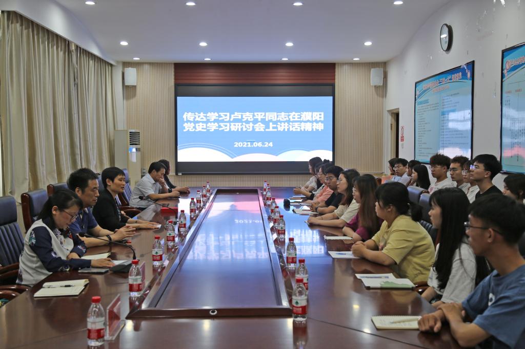 6月24日下午,校党委常委、副校长冯淑霞到我院传达学习校党委书记卢克平同志在濮阳党史学习研讨会上的讲话精神。会议在学院第二会议室举行,学院全体领导班子、教工学生各支部党员代表参与了此次学习。