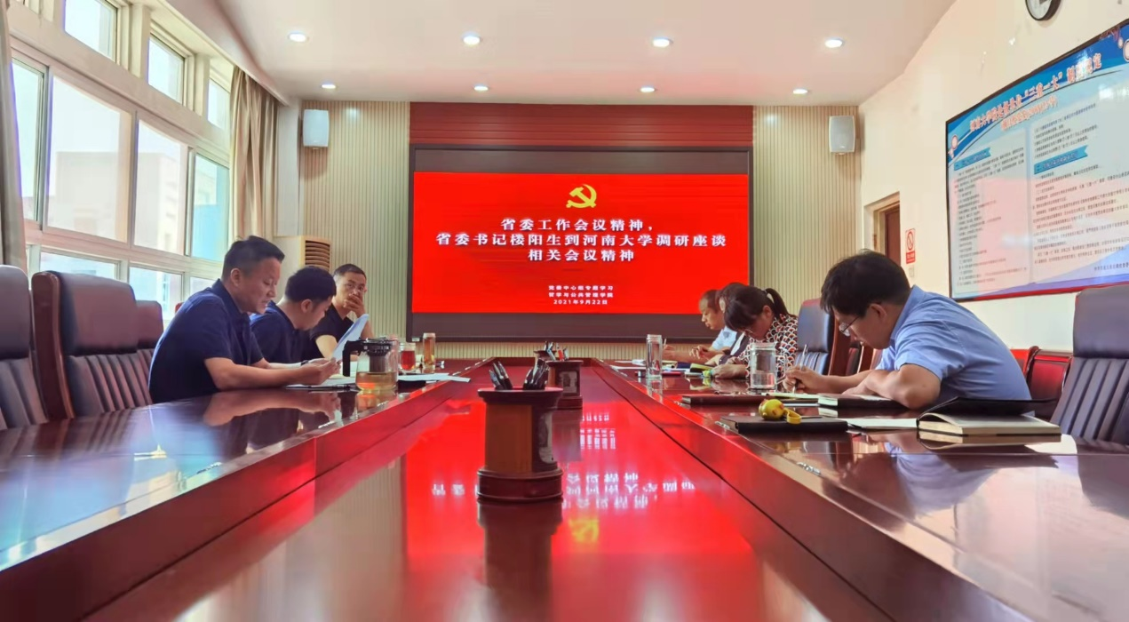9月22日,学院党委理论学习中心组召开专题会议,专题学习贯彻省委工作会议精神和省委书记楼阳生到河南大学调研座谈相关会议精神,并就学院未来发展做出规划研讨。