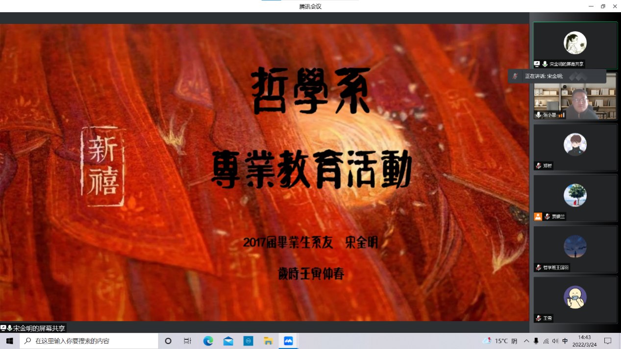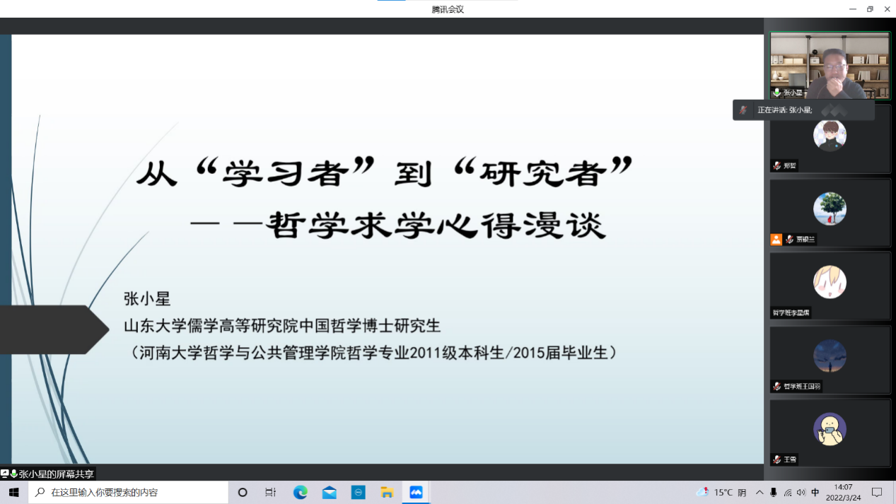 3月24日下午,我院于线上举办2021级哲学专业教育大会。学院副院长田丰韶、哲学系教师代表、哲学专业优秀校友代表应邀参会,2021级哲学专业全体本科生参加,会议由哲学系系主任王建刚主持。