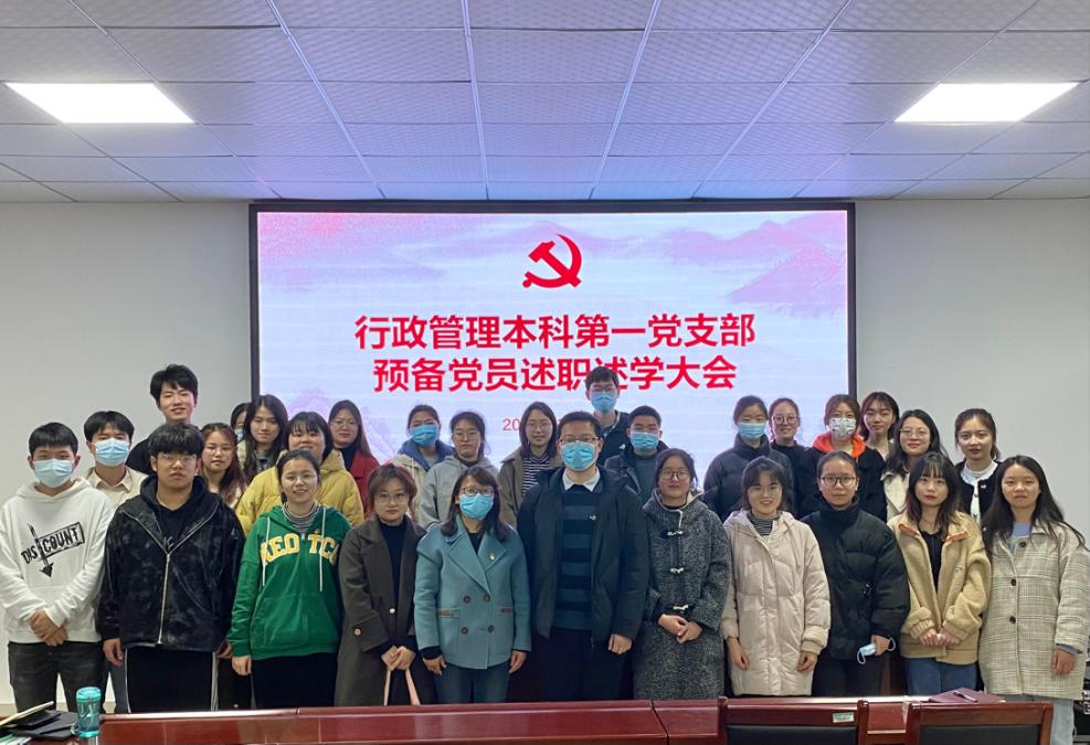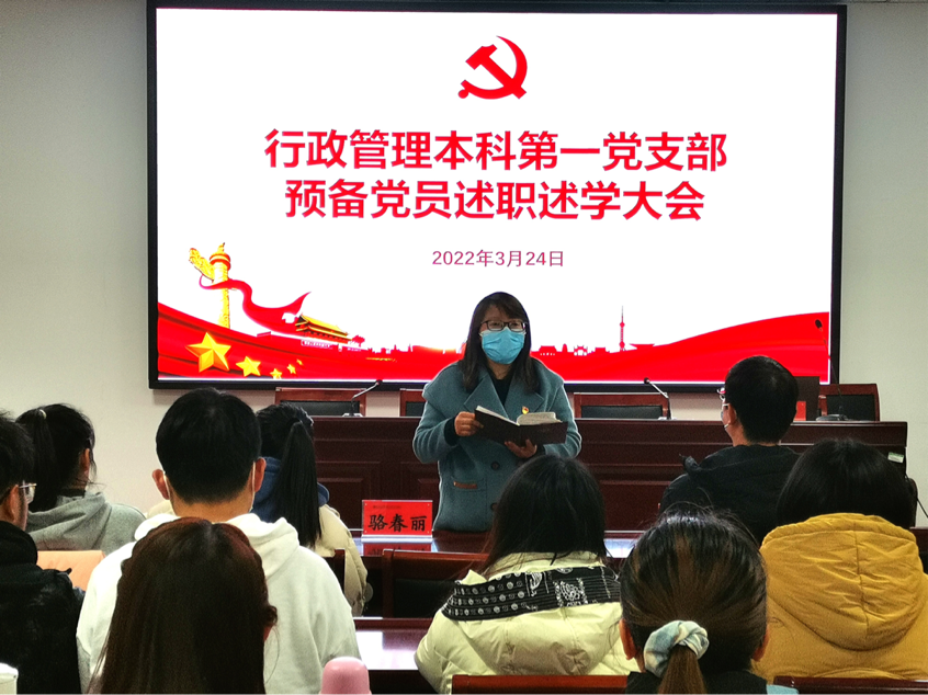为加强党员教育管理,发挥先锋模范作用,促进支部党员之间的交流与学习,3月24日上午,哲学与公共管理学院行政管理本科第一党支部在学院第三会议室召开预备党员述职述学大会。党支部书记骆春丽、本科2019级辅导员孙少飞和支部27名党员参加会议。