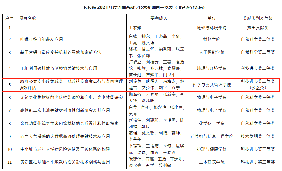 近日,《河南省人民政府关于2021年度河南省科学技术奖励的决定》(豫政〔2022〕10号)公布,我校共荣获2021年度河南省科学技术奖励11项,其中,我院刘俊英老师《政府公共支出政策减贫、财政扶贫资金运行与贫困治理绩效评估》获得科技进步奖二等奖(公益类)。