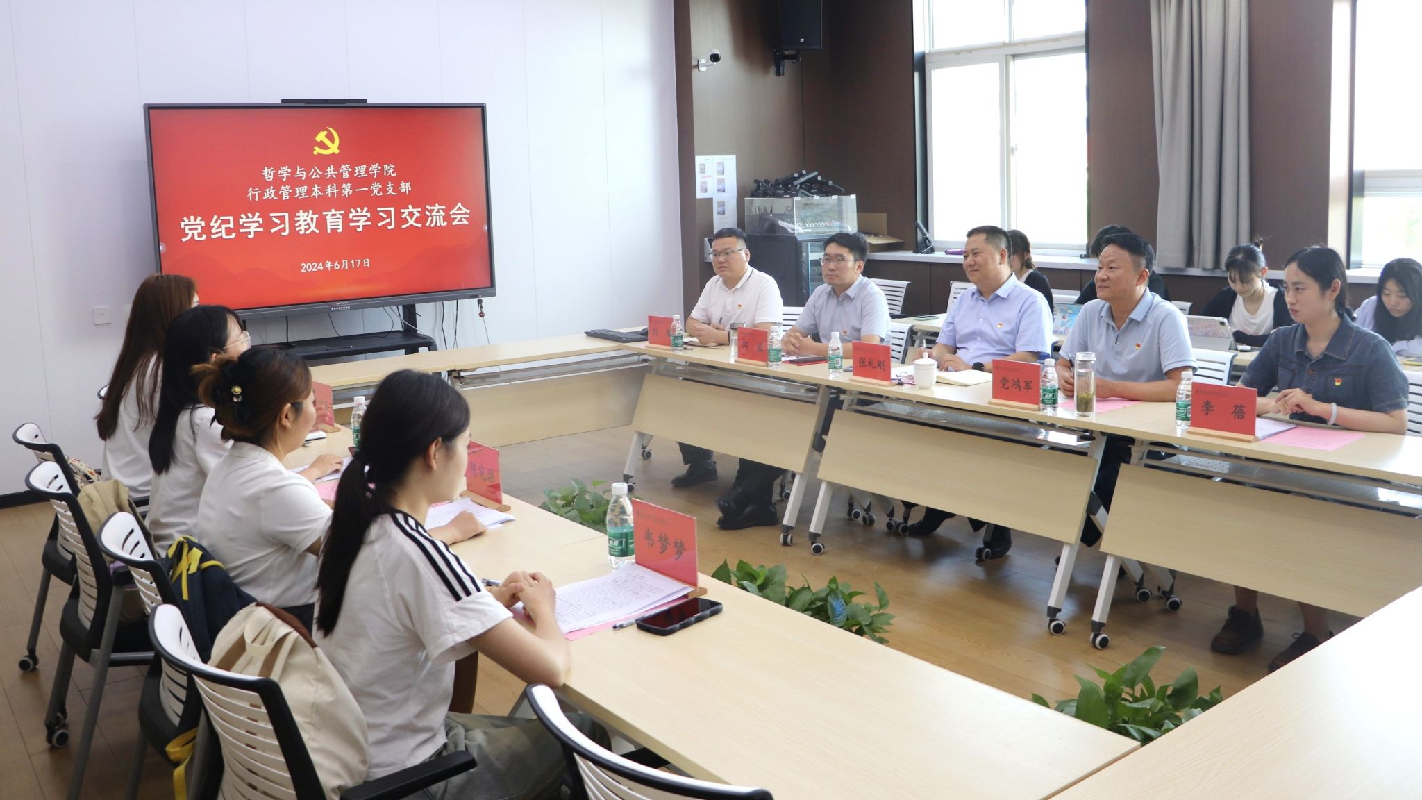 为深入学习贯彻习近平总书记关于全面加强党的纪律建设的重要论述,认真学习新修订的《中国共产党纪律处分条例》,按照学校党纪学习教育要求,6月17日下午,哲学与公共管理学院行政管理本科第一党支部在学院第二会议室召开党纪学习教育学习交流会,副校长张礼刚作为行政管理本科第一党支部联系校领导出席会议。学院党委书记党鸿军,学院党委副书记、行政管理本科第一党支部书记何威,学院团委负责人、哲学研究生党支部书记刘耀,本科2023级辅导员、行政管理本科第二党支部书记李蓓和行政管理本科第一党支部全体成员参加,会议由何威主持。