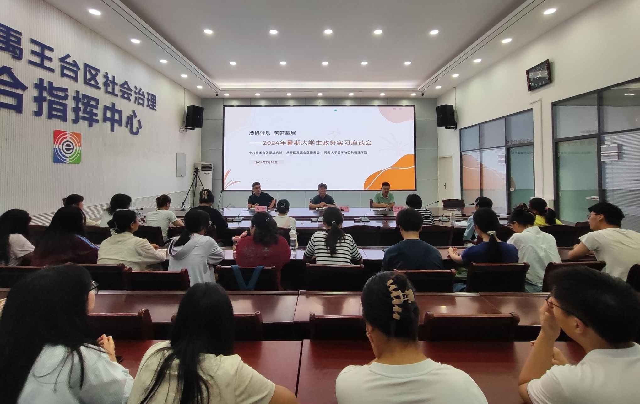 为深入了解前一阶段的实习情况,优化落实后一阶段的实习内容,7月31日,我院联合中共禹王台区委组织部和禹王台团区委在禹王台区区委会议室召开了2024年暑期大学生政务实习座谈会,副院长刘辉、共青团禹王台区区委副书记张家宾、本科2021级辅导员元帅和禹王台区实习生参加座谈会。会议由元帅主持。