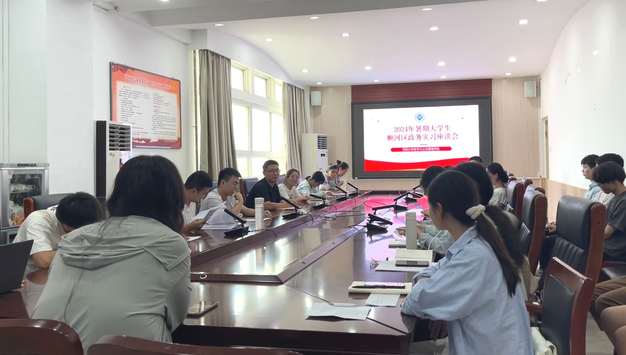 为全面掌握学生实习状况,进一步提升专业实习实效,7月31日下午,我院在学院三楼第三会议室举行2024年暑期大学生顺河区政务实习座谈会,本科2021级辅导员元帅与顺河区全体实习生参与此次座谈会。会议由元帅主持。